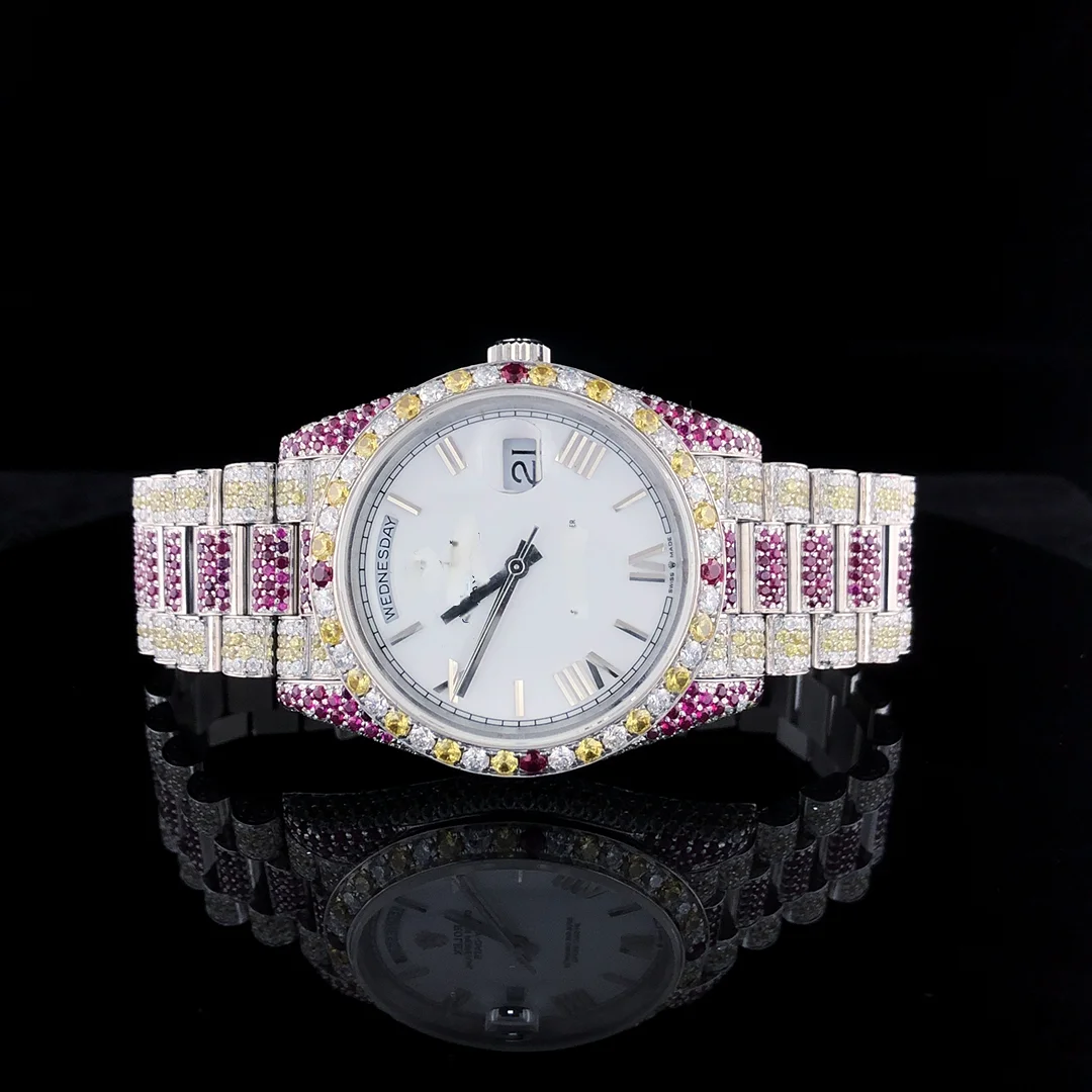 Fully Customised RedYellow Stainless Steel Men's Watch White Diamond Plated ETA Quartz Movement Coin Luxury Sport/Fashion