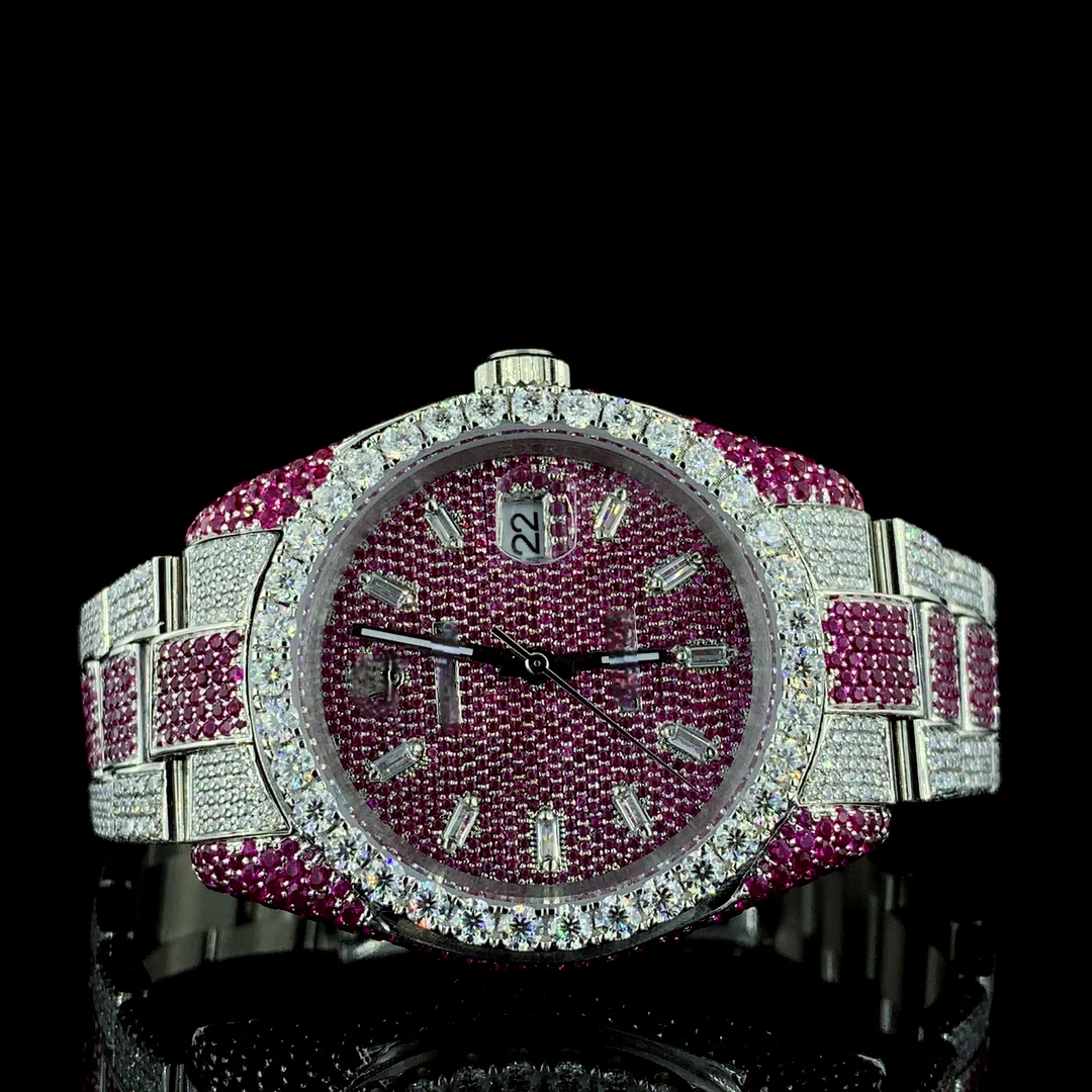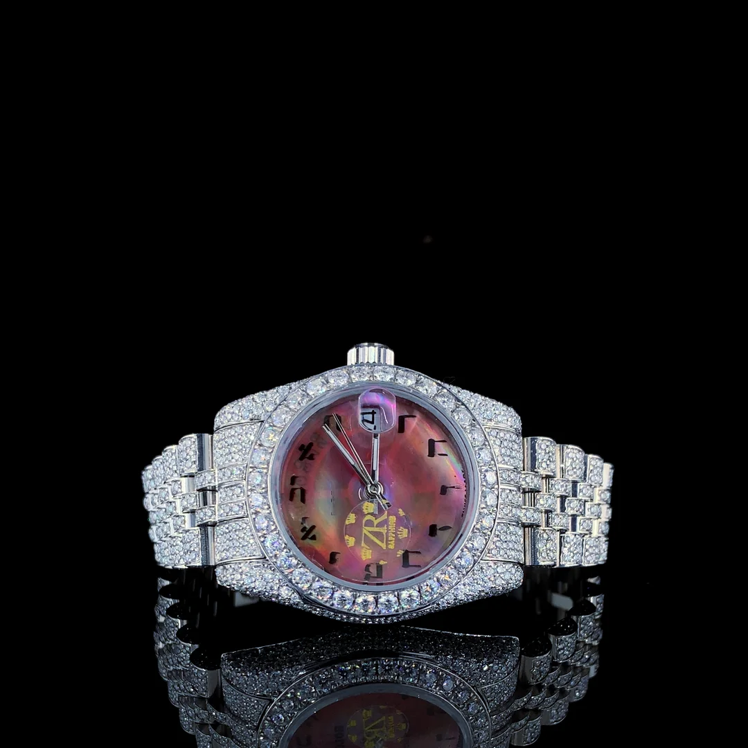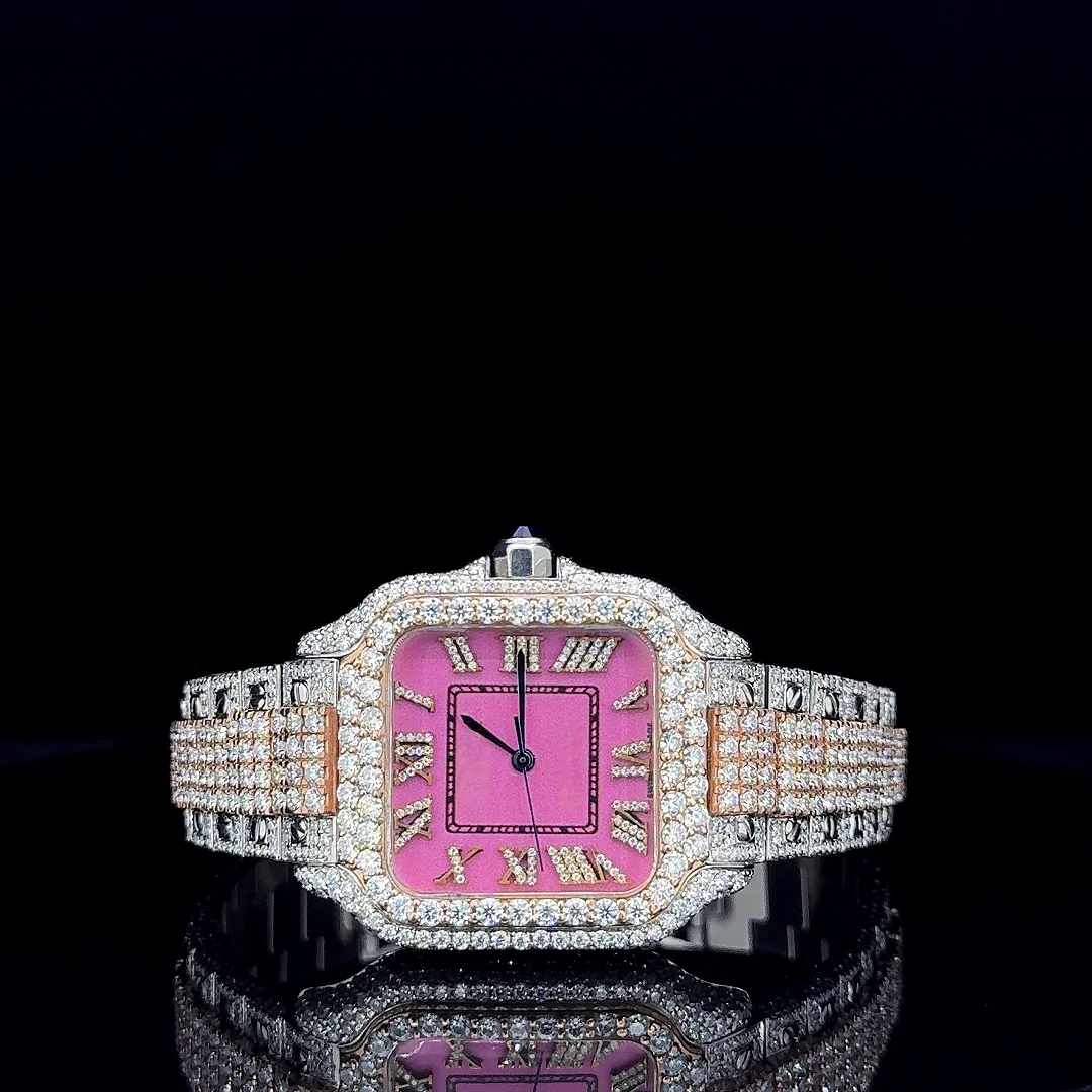 VVS Moissanite Diamond Full Iced Men's Watch Stainless Steel Quartz Movement Business Sport Style White Pink Dial Birthday Gift