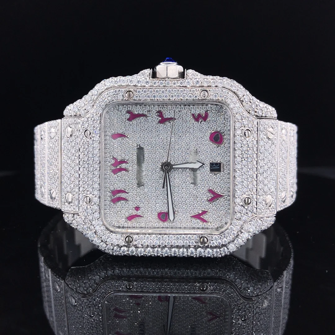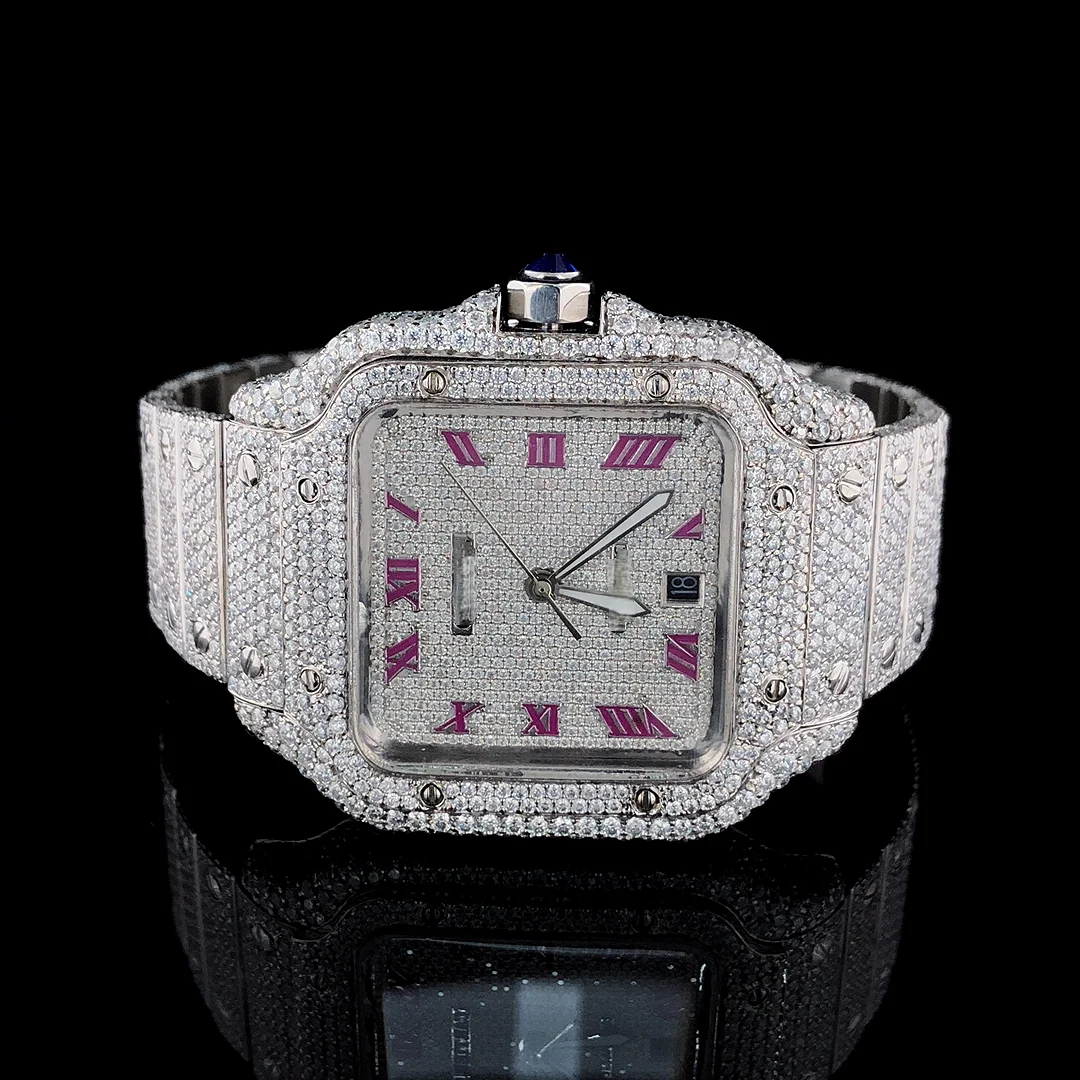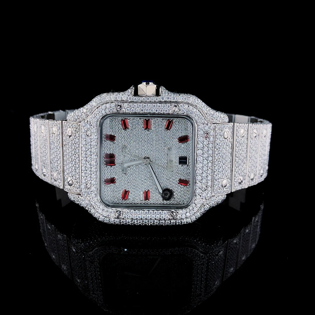 Latest Sport Fashion Hip Hop Shape VVS Quality Moissanite Quartz Watch Automatic Date Feature Stainless Steel Glass Dial
