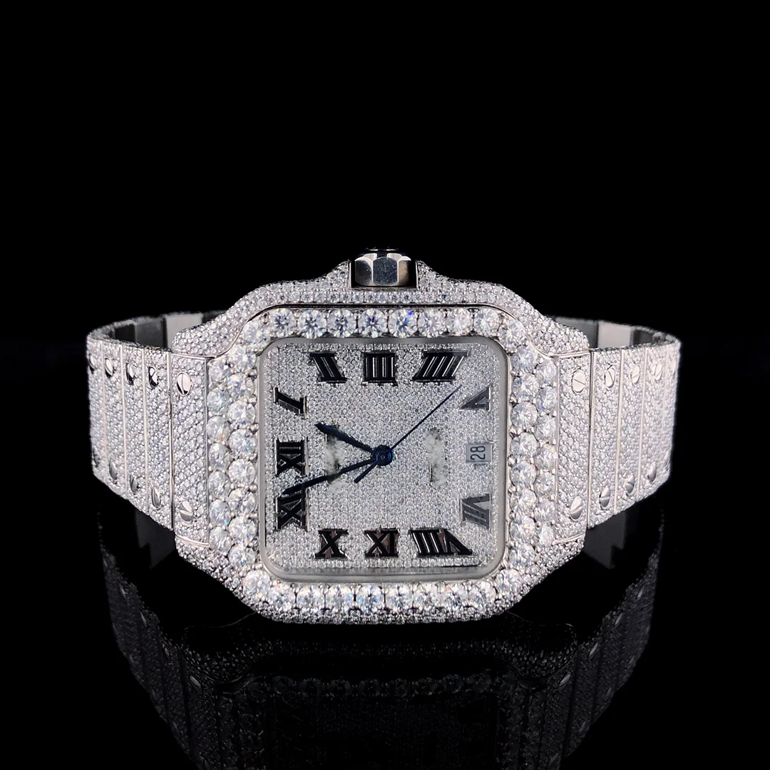 VVS Moissanite Diamond Men's Sport Business Watch Stainless Steel White Gold Plated Roman Hip Hop Style Quartz Fashion Gift for