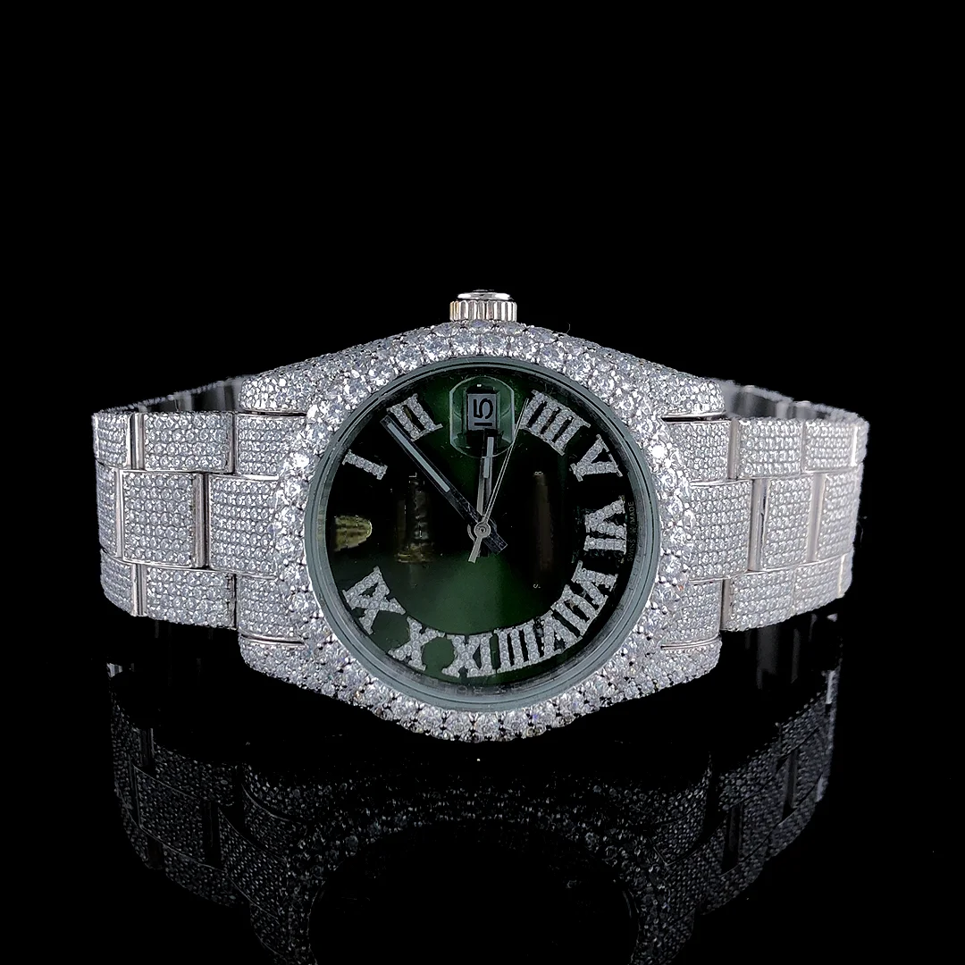 VVS Moissanite Diamond Men's Watch 41mm Green Glass White Gold Plated Stainless Steel Fully Iced Quartz Sport Business Fashion