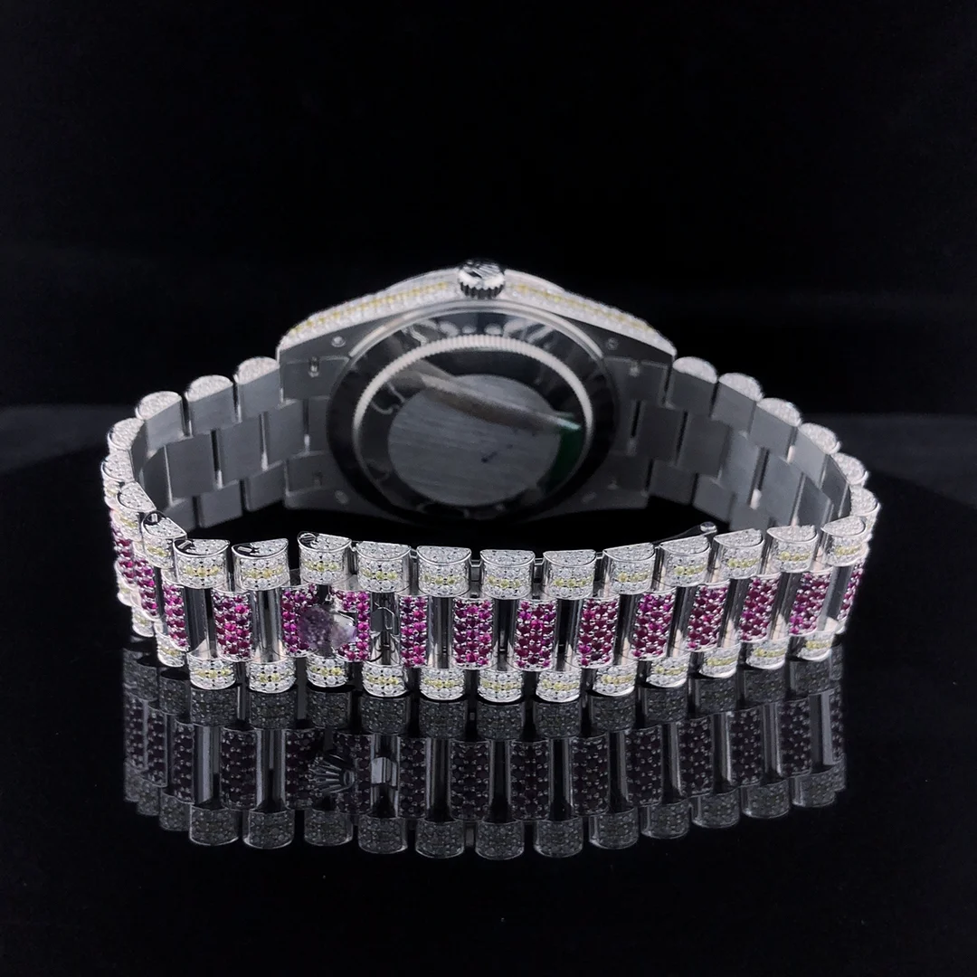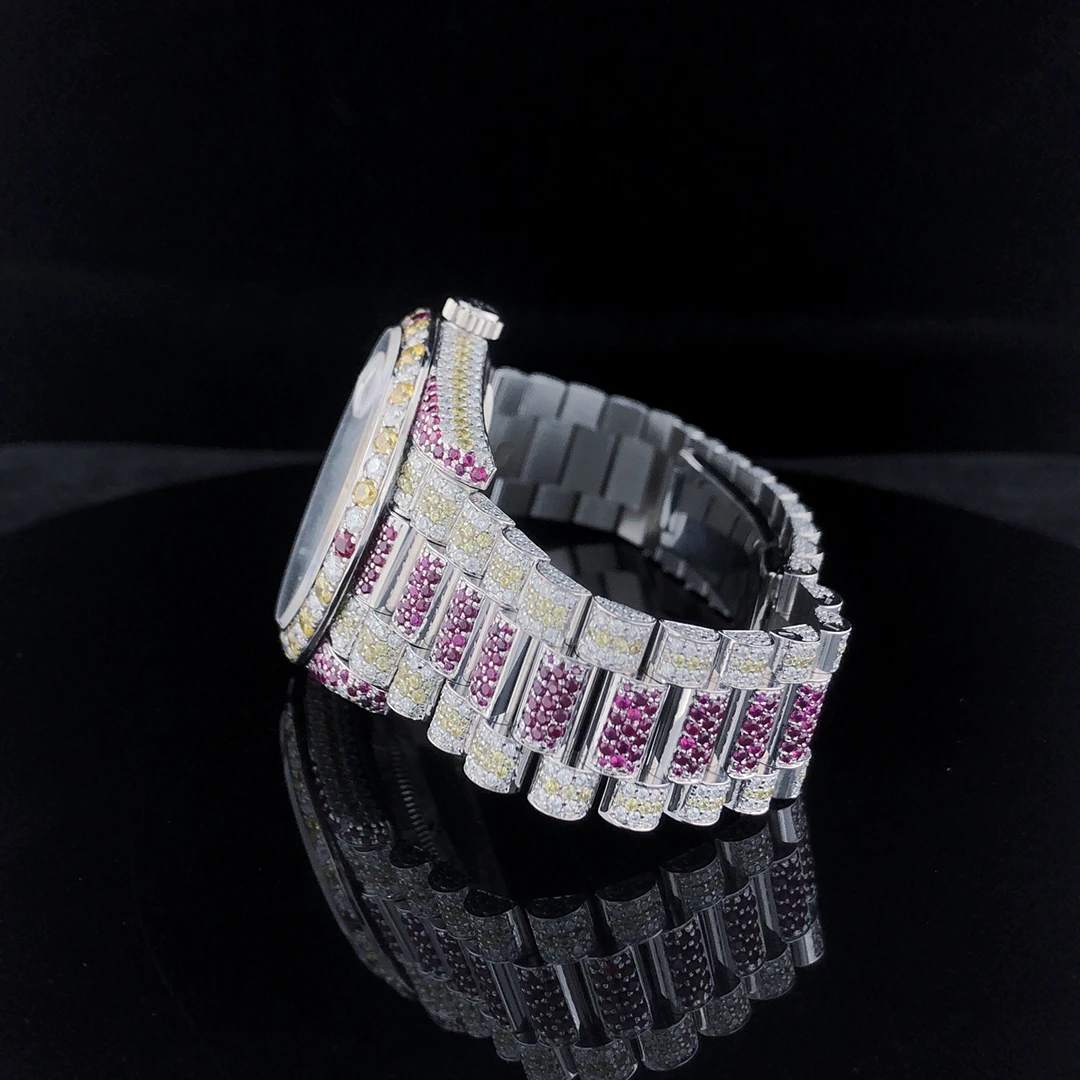 Fully Customised RedYellow Stainless Steel Men's Watch White Diamond Plated ETA Quartz Movement Coin Luxury Sport/Fashion