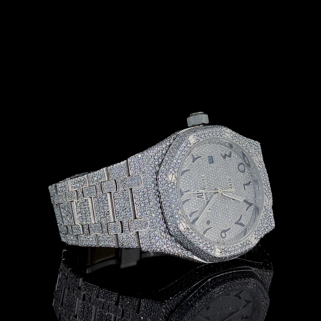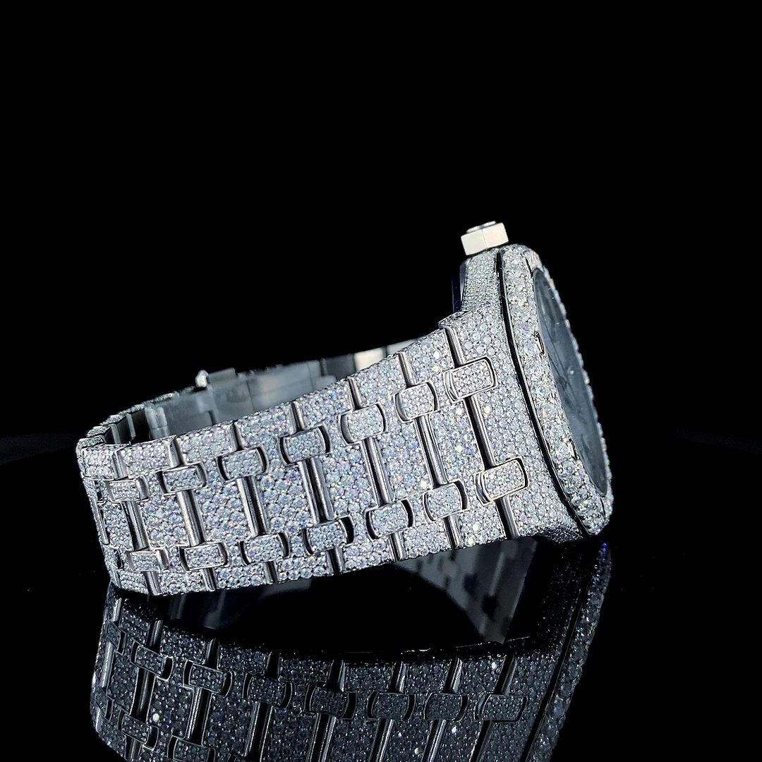 Premium Moissanite Diamond Quartz Sport Business Fashion Watch Arabic Black Numerals Dial Glass Stainless Steel Case Hip Hop