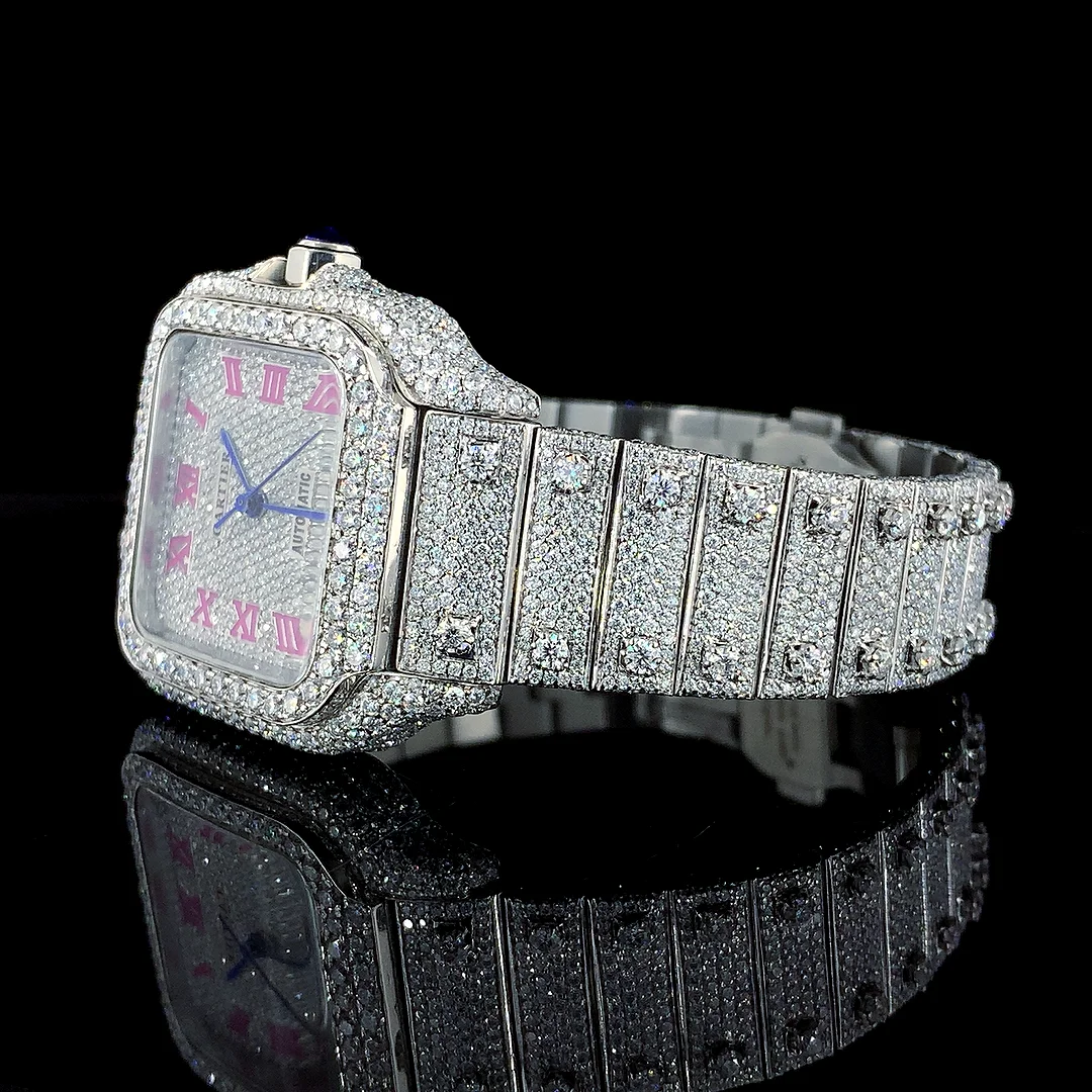 VVS Moissanite Diamond Full Iced Men's Watch Stainless Steel Quartz Movement Business Sport Style White Pink Dial Birthday Gift