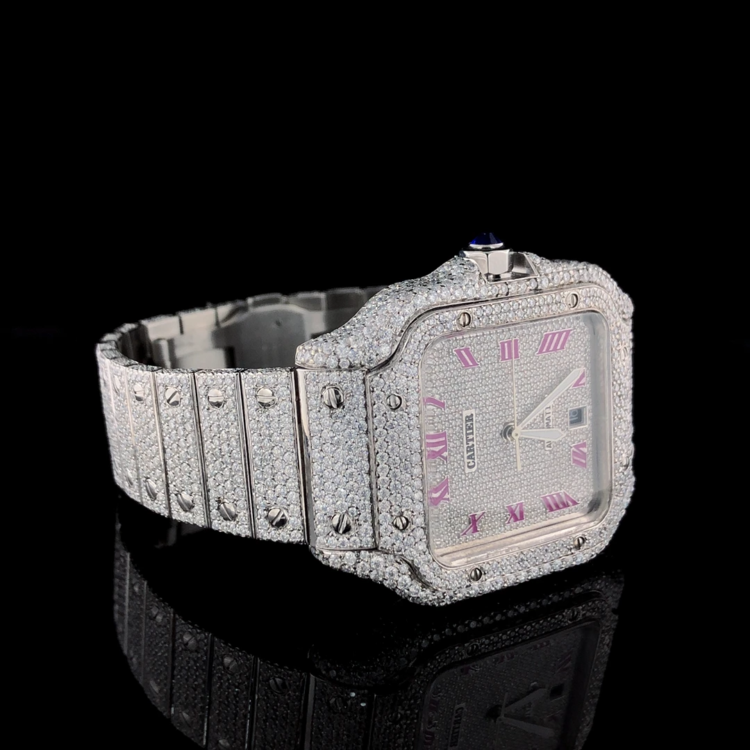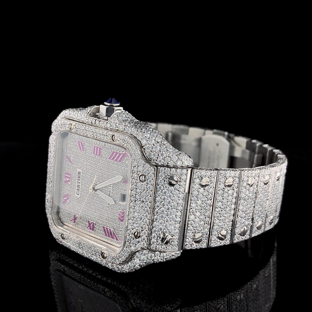 VVS Moissanite Diamond Men's Sport Business Coin Watch Square Quartz Glass Crystal White Gold Plated Stainless Steel Roman